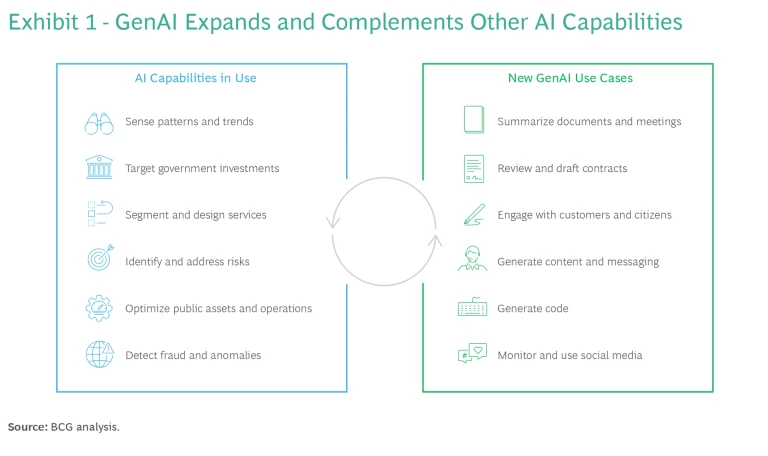 The use of GenAI offers significant potential productivity gains for the public sector. It can improve the quality and speed of government decision-making at scale and raise the efficiency and effectiveness of public policies, programs, and services. The new GenAI tools complement existing AI capabilities already used in the public sector. (See Exhibit 1.)
