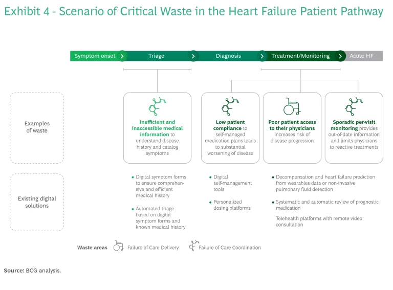 When digital solutions are offered in a hybrid setting, they can significantly reduce three of the largest care-related categories of waste: failure to deliver optimal care, failure to coordinate care, and overtreatment. (See Exhibit 1.) To demonstrate the benefits of hybrid care, we examine case studies for two conditions—melanoma and heart failure—highlighting how this approach can boost prevention, improve coordination of care, decrease overtreatment, and reduce hospital admissions, complications, and mortality. We also identify six enablers necessary to achieve the full benefits of integrated care.