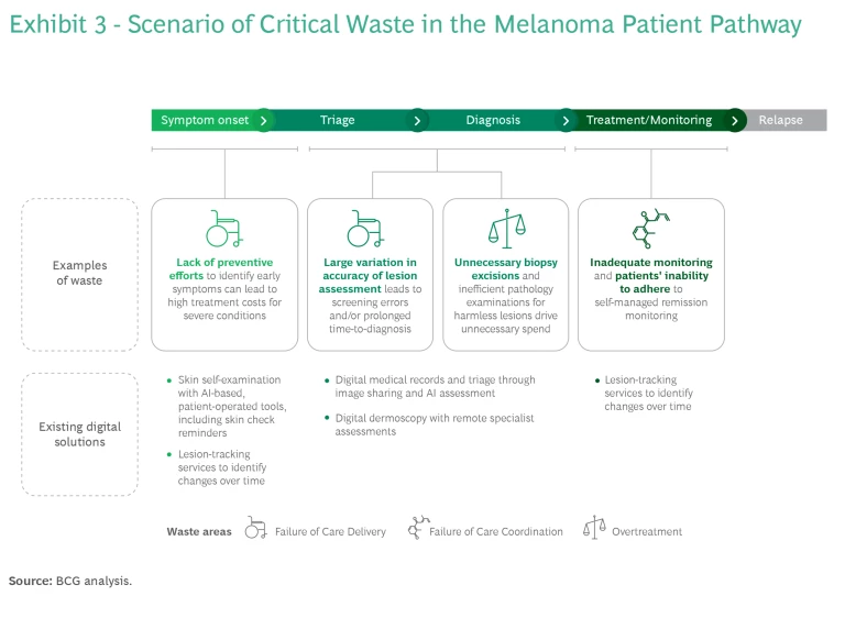 For practitioners, AI-based tools can support decision-making and decrease screening errors—and at lower costs than non-digital methods. Studies have shown that AI tools improve diagnostic precision in identifying malignant lesions and deliver results in seconds. Digital tools also enable primary care physicians to consult with specialists remotely, via a digital platform, thereby eliminating unnecessary procedures (such as biopsies for harmless lesions). (See Exhibit 3.)