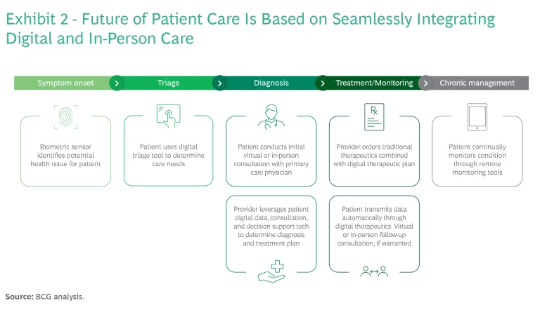To realize the vast potential of digital in health care, we need ecosystems that integrate digital solutions into the traditional care setting, enabling end-to-end patient journeys. (See Exhibit 2.) Telemedicine providers and other tech companies have a clear head start given their technological capabilities. If they can partner with physical providers and integrate with health care systems to build a hybrid ecosystem, they can deliver more sustainable and valuable business models.