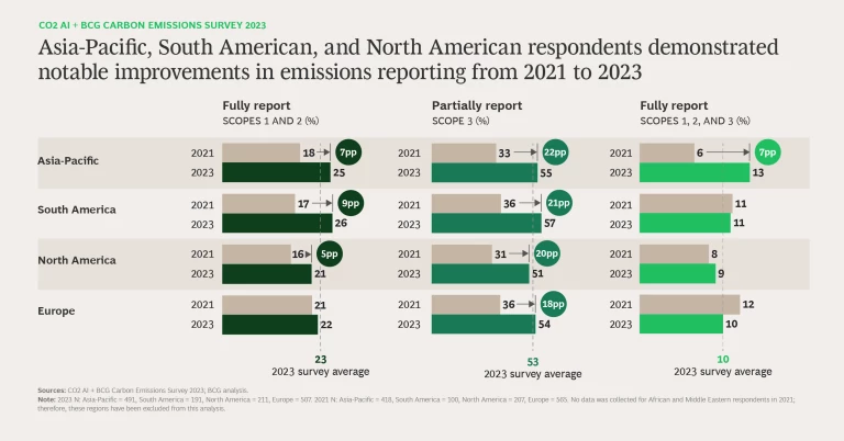 In addition, some regions have demonstrated a clear improvement in emissions measurement during the past two years. Since 2021, the number of Asia-Pacific respondents comprehensively reporting Scopes 1, 2, and 3 emissions increased by 7pp, while the number of South American and North American respondents comprehensively reporting their internal emissions—Scopes 1 and 2—grew by 9pp and 5pp, respectively.