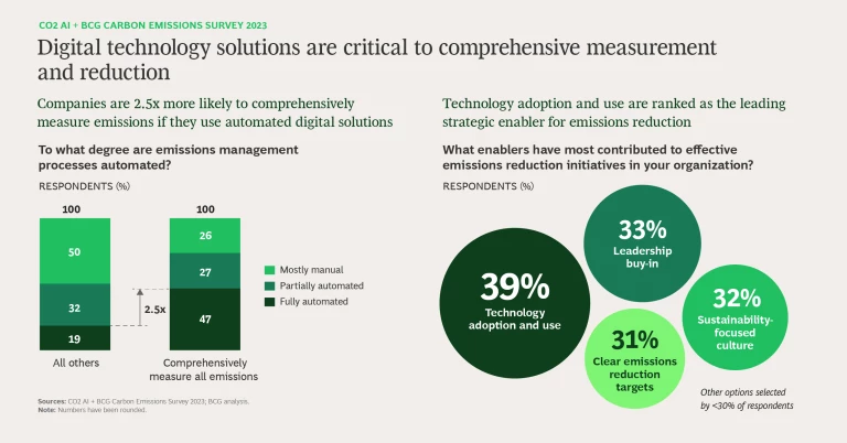 Harnessing the Power of Digital Technology. Technology solutions improve accuracy and efficiency when assessing emissions and can help identify innovative ways to reduce them. Our survey finds that companies with automated digital solutions for measurement are 2.5 times more likely to measure their emissions comprehensively. In addition, surveyed companies listed technology adoption and use as the leading strategic enabler for improving emissions reduction in their organization.