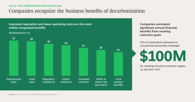 Decarbonization provides a host of financial and nonfinancial rewards to businesses. A growing number of companies recognize this, citing the following as top benefits: reputational value, lower operating costs, greater regulatory compliance, higher valuations, increased revenues, the improved attraction and retention of talent, and tax savings. When asked to quantify, 40% of respondents estimated an annual financial benefit of at least $100 million for meeting emissions reduction targets, a 3pp increase compared with last year’s survey.