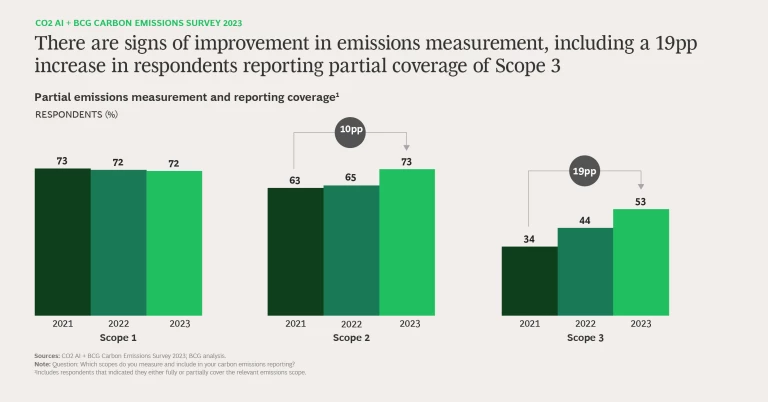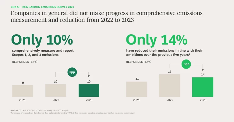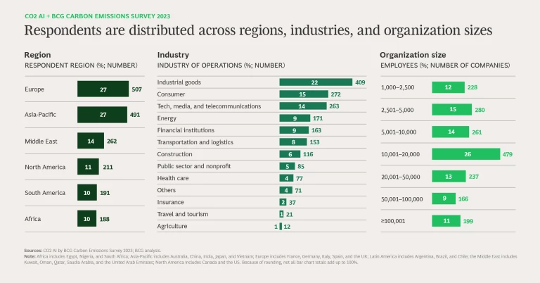 Our CO2 AI + BCG Carbon Emissions Survey 2023 continues the work that we began in 2021 and continued in 2022 to investigate the progress that businesses around the world have made on emissions measurement and reduction. (See “Our Methodology.”)