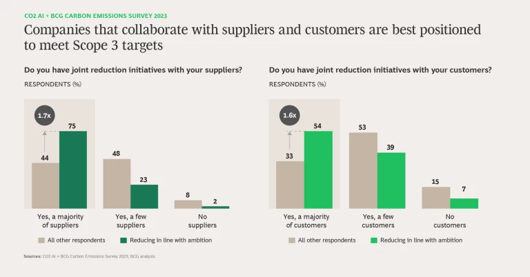 Collaborating with Suppliers and Customers. As indicated above, companies globally have made strides in expanding their Scope 3 coverage and establishing reduction targets over the past two years. Businesses reported that, in their efforts to meet these new targets, they have benefited significantly from robust partnerships with both suppliers and customers. Indeed, 75% of companies that cut emissions in line with their ambition have joint reduction initiatives with most of their suppliers, and 54% have similar initiatives with most of their customers.
