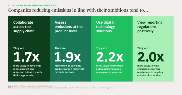 When we compare companies that report reducing their emissions in line with their ambitions and those that do not, we find that the former disproportionately display four notable traits: