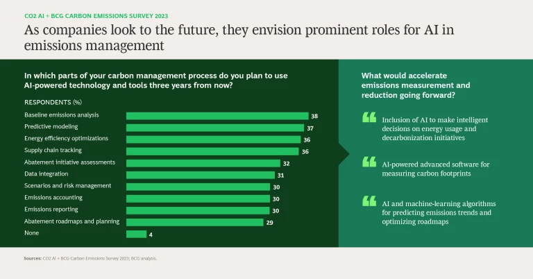 As AI matures, digital technology solutions will continue to improve accuracy, efficiency, and decision making in emissions management. Companies recognize this potential. Of those surveyed, about 30% plan to expand deployment of AI-powered tools in the next three years across a variety of functions, including predictive modeling and supply chain tracking.