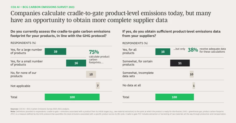 Calculating Emissions at the Product Level. We find that 75% of companies attempt to measure emissions for at least some of their products from cradle to gate, that is, from raw materials to distribution. To be most effective, these product-level assessments require regular supplier input and accurate attribution of emissions to each product.