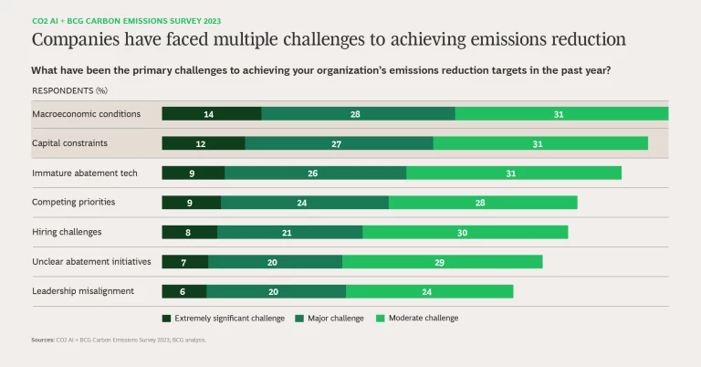 Only 10% of companies reported comprehensively measuring all their emissions, revealing no improvement relative to our 2022 survey. More concerning, only 14% of companies indicated reducing emissions in line with their ambitions, down 3pp from those reporting the same in 2022. Companies indicated that their reduction efforts have been obstructed by several challenges, most notably difficult macroeconomic conditions and capital constraints.