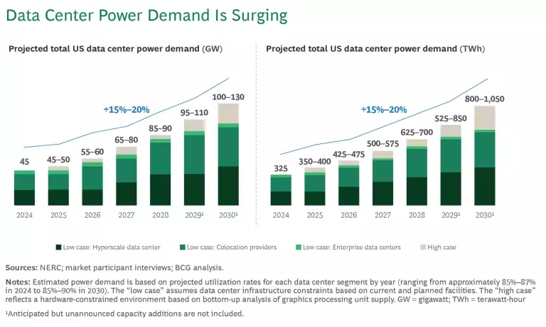 The growing adoption of AI is expected to increase US electricity consumption by 15% to 20% annually through 2030, driven by the expansion of data centers. (See exhibit.) However, the current grid already faces challenges in balancing reliability standards with the need for lower-carbon energy. This underscores the trade-offs required among reliability, cost, and sustainability in powering AI infrastructure.