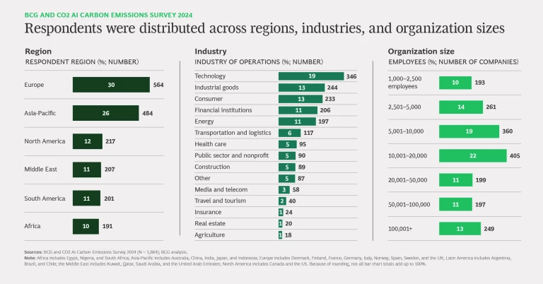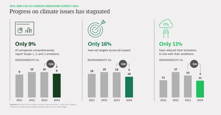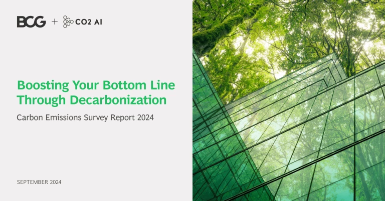 In this year’s edition of the BCG + CO2 AI Carbon Emissions Survey, we polled executives from businesses around the world that are, collectively, responsible for about 45% of global greenhouse-gas (GHG) emissions. This survey continues the work that we began in 2021 and continued in 2022 and 2023 to investigate the progress companies have made on emissions measurement and reduction—and to shed light on the actions they can take to decelerate climate change.