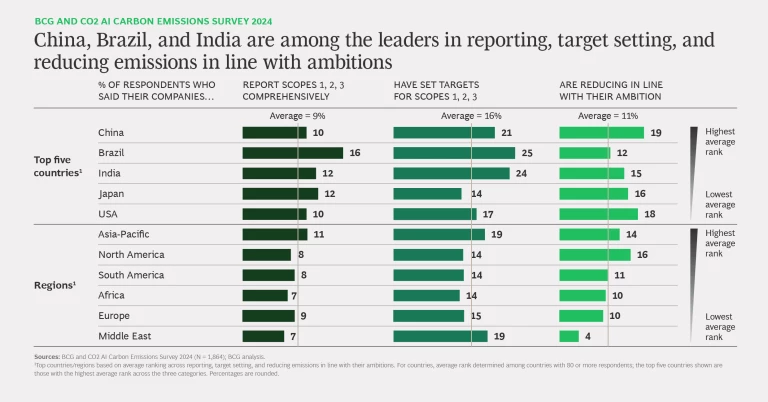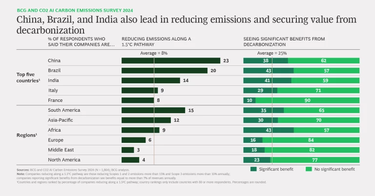 Nonetheless, there are some bright spots. Companies in Brazil, India, and China are leading in terms of comprehensive emissions reporting, target setting, and reducing emissions in line with ambitions. And even as overall progress seemed to slow, 25% of the businesses in our survey reported substantial financial benefits from decarbonization.