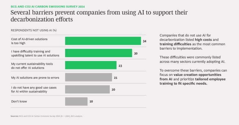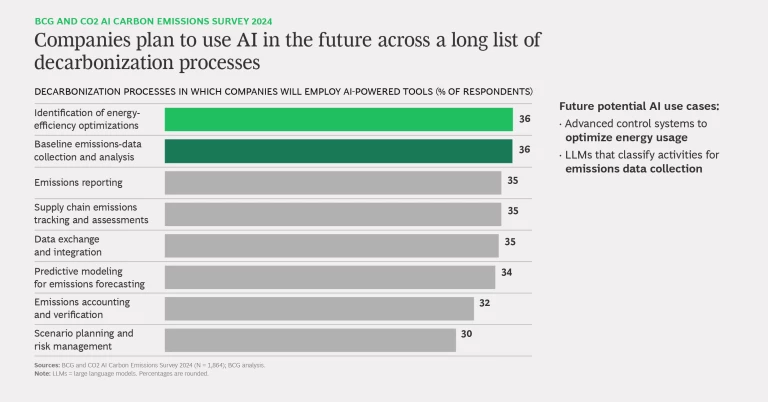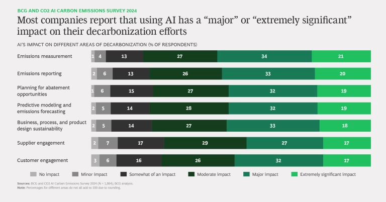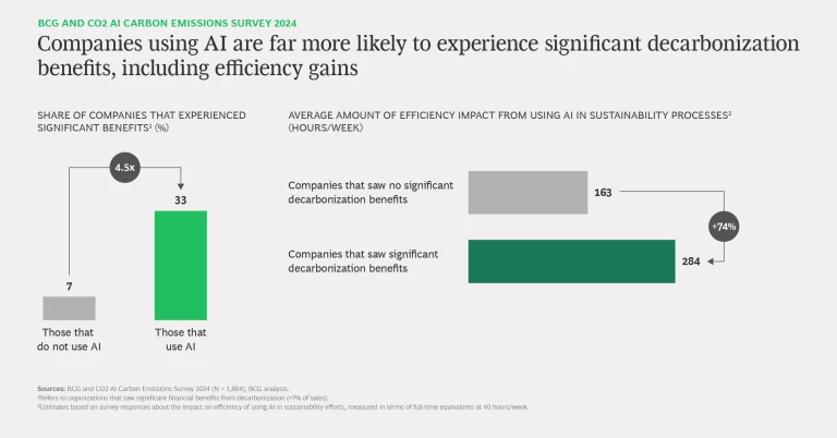 AI Usage. Companies that use AI to help reduce emissions are 4.5 times more likely to experience significant decarbonization benefits. This is primarily because AI-powered tools increase the efficiency of sustainability efforts by automating tasks, allowing teams to focus more on strategic activities, such as emission reductions and value capture. (See “The Promise of AI.”)