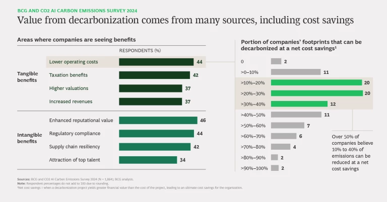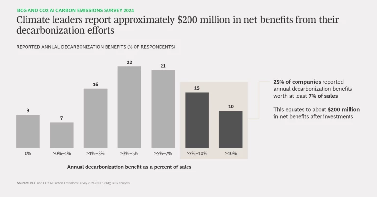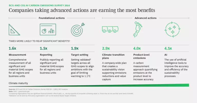 However, many of the climate leaders in our survey have realized significant value from their decarbonization efforts, including financial benefits equal to more than 7% of their revenues—for an average net benefit of $200 million a year. To achieve these financial benefits, leading companies are stepping beyond foundational actions, such as measuring and reporting emissions, and adopting more advanced actions—including using AI in their climate efforts and calculating product-level emissions—to support their decarbonization journeys.