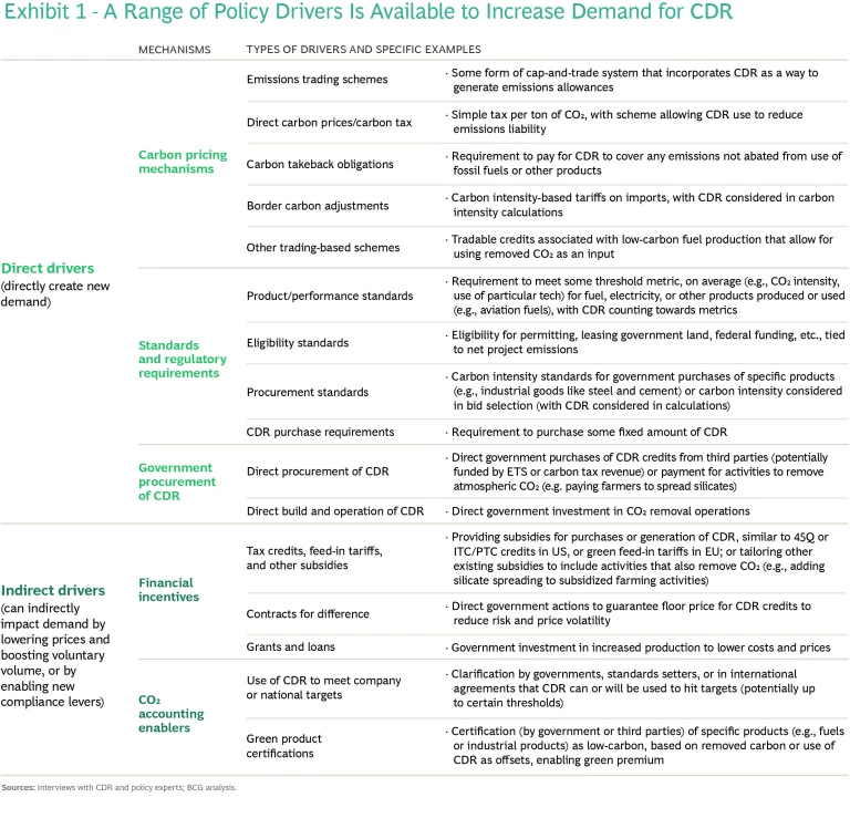 Direct demand drivers include the integration of durable CDR into carbon pricing mechanisms, regulatory requirements to decarbonize, and government procurement of CDR. Indirect drivers include enabling policies, such as financial incentives to reduce prices, and CO2 accounting enablers, such as requirements that must be met for a company to claim it is “net zero.” In addition to promoting the scale-up of durable CDR demand, many of these policies could also play a major role in incentivizing the maximum emissions reductions possible. (See Exhibit 1.)