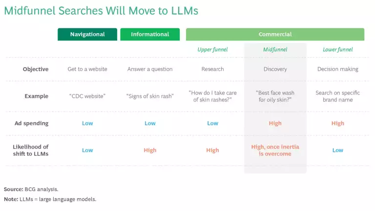With LLMs, the process is compressed, and consumers may see only two or three products or brands in the query output. Particularly affected will be companies with high midfunnel volumes (such as retail and entertainment) or those that spend heavily on search (such as finance, tech, retail, and autos).