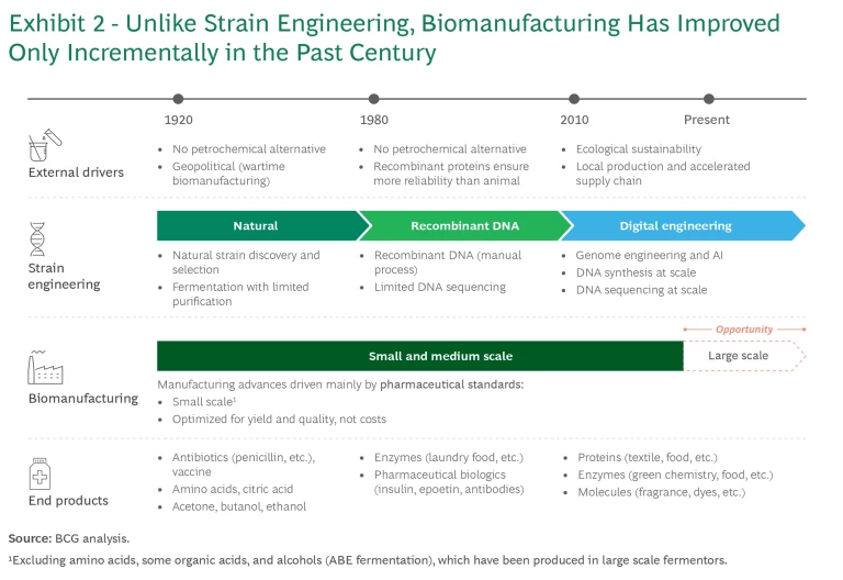 There has been great progress in the lab, with the development of new molecules and genetic strains. The big barrier to broader adoption so far has been biomanufacturing costs. With the exception of pharma—whose business models are mainly built on high-margin, low-volume products with low sensitivity to costs—and a few other product categories, precision fermentation and biomanufacturing have not yet proved to be economically viable at commercial scale.