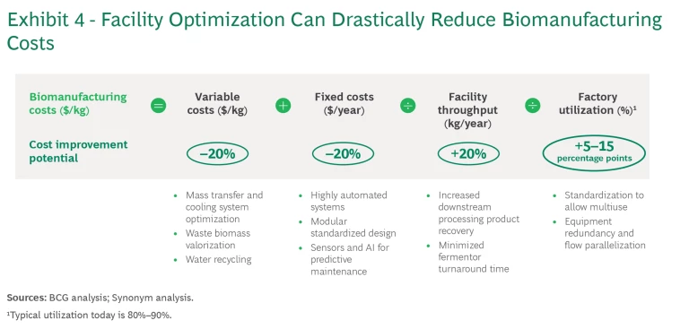BCG’s new report, prepared in collaboration with Synonym—a developer of physical, digital, and financial biomanufacturing infrastructure—details how biomanufacturing can finally fulfill its promise of achieving commercial scale. Some of the necessary innovations, such as the use of AI and high-precision sensors, will require advances in technology, but many involve only cost optimization related to process engineering. These levers focus on such high-cost items as energy demand and labor and maintenance, and companies can apply them today.