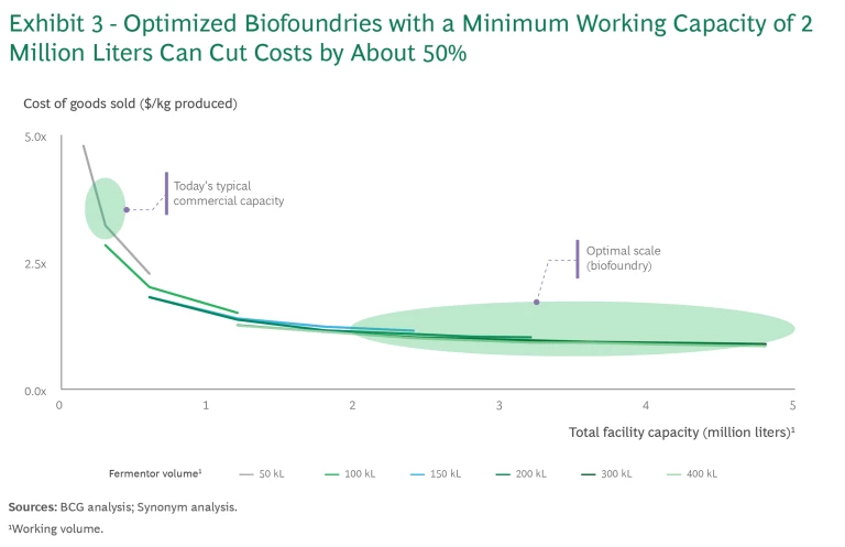 Enter biofoundries—facilities that are designed, built, optimized, and standardized for efficient and economic production of nonpharma bioproducts. Each such facility can provide at least 2 million liters of capacity, achieving commercial economics and bridging the cost gap for large production categories such as food and biomaterials by reducing unit costs by 50%, enabling some cost parity with incumbent technologies. (See Exhibit 1.)