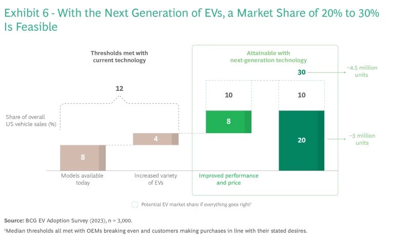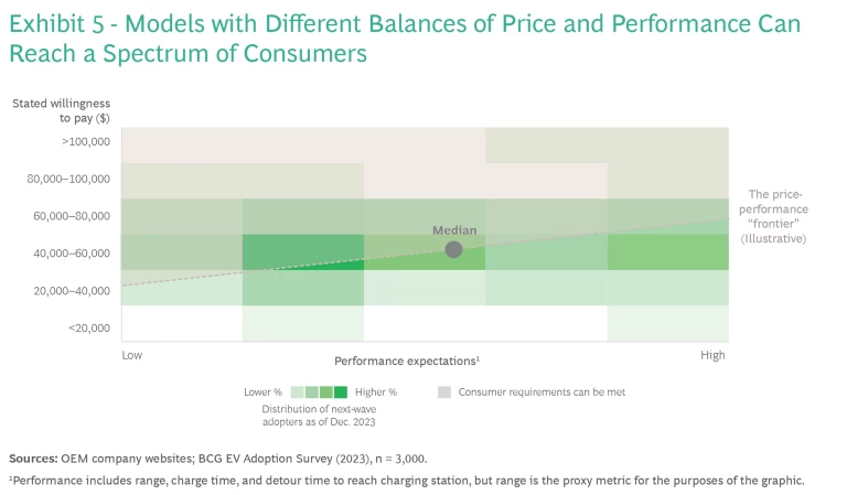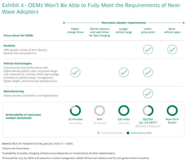An encouraging finding from our research, however, is that OEMs appear to be capable of technologically achieving several of the median thresholds for next-wave adopters when they release their next generation of EV platforms. (See Exhibit 4.)