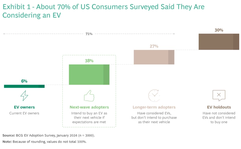 - In addition to the 6% that already own an EV, 38% of US consumers surveyed said they intend to purchase an EV as their next vehicle. Another 27% are considering buying one in the future. (See Exhibit 1.)