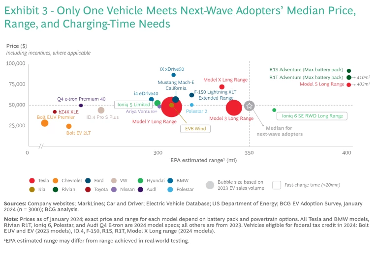 Only one vehicle available today—the Hyundai Ioniq 6, first sold in the US in March 2023—meets the median consumer thresholds for price, range, and charge time cited above. The Tesla Model 3, one of the best-selling EVs in the US, closely follows. (See Exhibit 3.)