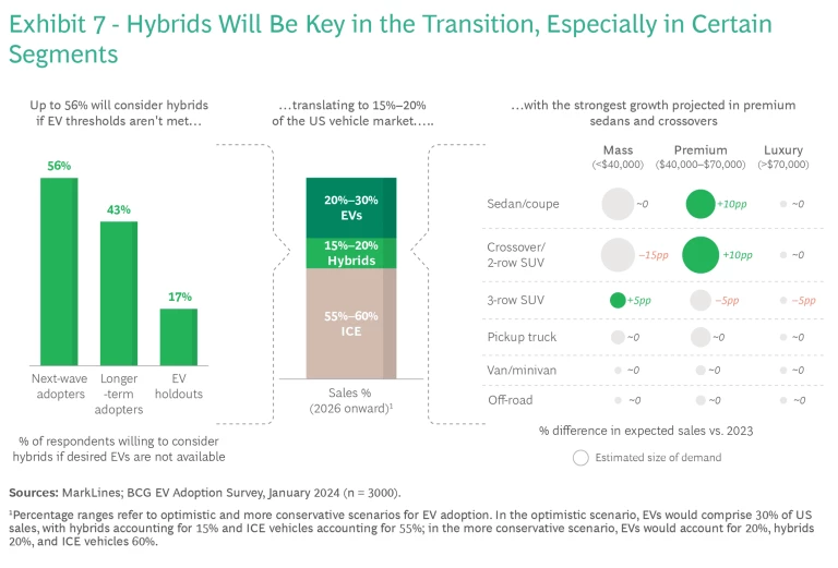 - In either scenario, hybrids will play an important role, accounting for a 15% to 20% share of US sales once the next generation of EVs are on the market.