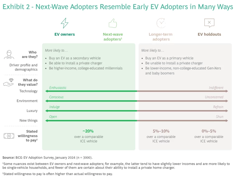 In many ways, the profile of the next wave of adopters resembles that of current EV owners. Most next-wave buyers can install chargers at home and are more likely to have a secondary vehicle. Demographically, consumers in both groups tend to be men who are college-educated millennials with relatively high incomes. Attitudinally, they’re less price sensitive, more enthusiastic about technology, and more likely to indulge in a luxury purchase than the overall US market. (See Exhibit 2.)