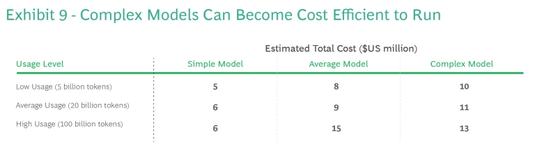 Also worth noting is that while the simple model offers better efficiency at lower usage levels, at higher volume the complex model might be more economical. Complex models can become less expensive to run than average models at high usage rates. (See Exhibit 9.) These insights demonstrate that aligning model complexity with expected usage is extremely important to optimize performance and costs.