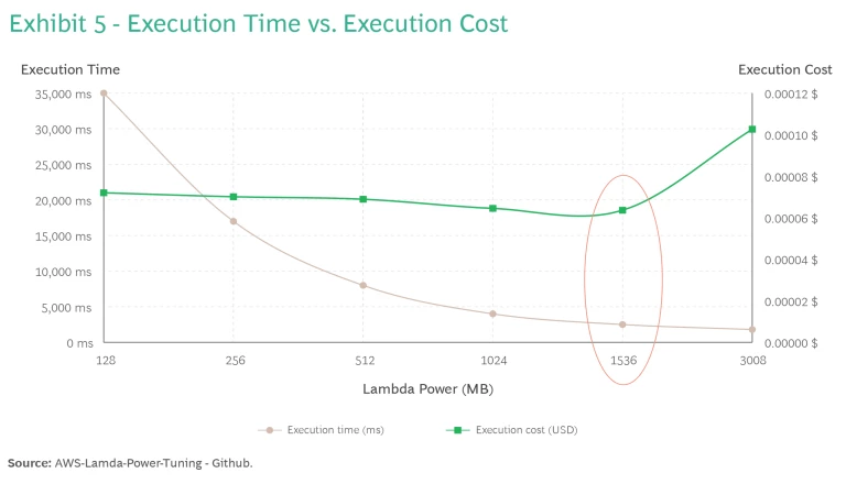 Besides memory, AWS allocates more CPU to larger power allocations, resulting in faster function execution. Determining the optimal power configuration means finding the sweet spot between the fastest execution and the lowest cost. For example, as shown in Exhibit 5, execution time goes from 35s with 128MB to less than 3s with 1.5GB, while being 14% cheaper to run.