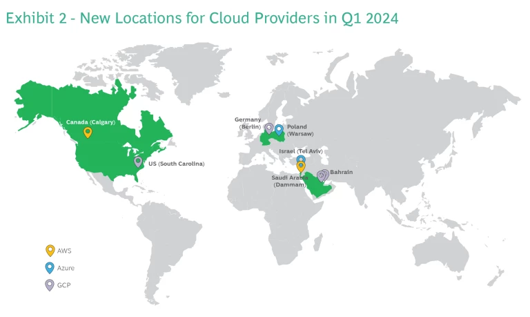 While AWS, Azure, and GCP all added locations in the first half of 2024, there were notable differences in the expansion strategies. (See Exhibit 2.) Azure added two locations (Tel Aviv, Warsaw); AWS also added two (Tel Aviv, Calgary); while GCP added four locations (Berlin, Dammam in Saudi Arabia, Doha, and South Carolina).