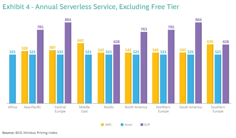 The downside to serverless is that, in contrast to the traditional virtual machines pricing model, pricing for a given set of parameters is often inconsistent across regions. (See Appendix 2 for pricing differences and Appendix 3 for city-level pricing.) Azure is the only player in the market which shows consistent per-unit pricing across all regions, something that engineering teams appreciate since they can run their applications on Azure functions without worrying too much about the most cost-effective region. (See Exhibit 4.)
