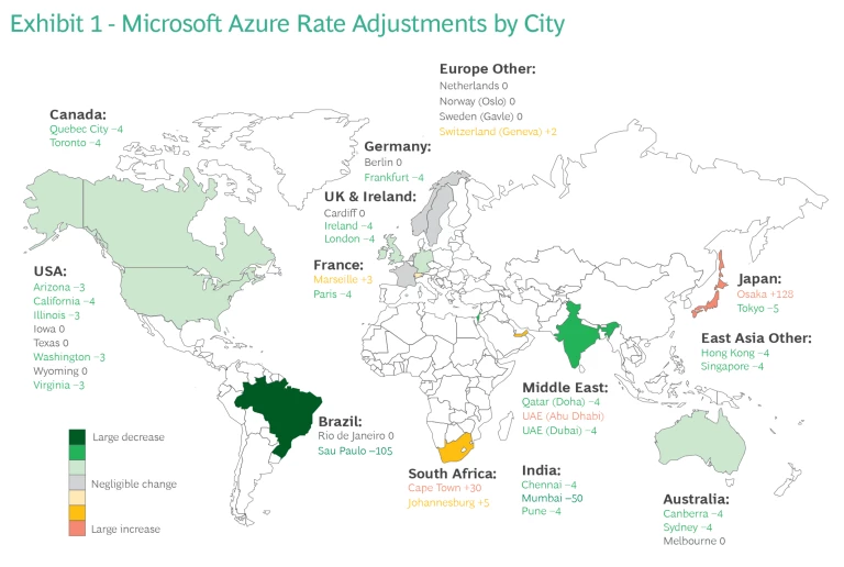 Azure was the only CSP that changed rates in existing locations in the first half of 2024, driven by adjustments in compute rates. (See Exhibit 1.) Storage and network rates remained consistent. Globally, Azure’s pricing adjustments resulted in mostly small changes in each region. The most dramatic swings occurred in Osaka (+$128), Abu Dhabi (+$31), Cape Town (+$30), Mumbai (–$50), and São Paulo (–$105). Even with the substantial Osaka rate increase, Azure still offers the lowest rates in that city. Moreover, its competitive pricing in Tokyo means Azure is the most affordable CSP in Japan.