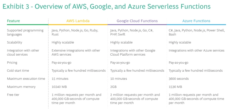 With serverless, DevOps teams can build and run applications and services without thinking about the servers running the code. They can focus on improving code, processes, and upgrade procedures, instead of on provisioning, scaling, and maintaining servers. AWS Lambda, Azure Functions, and Google Cloud Functions are some of the most popular offerings in the serverless cloud market. (See Exhibit 3.)