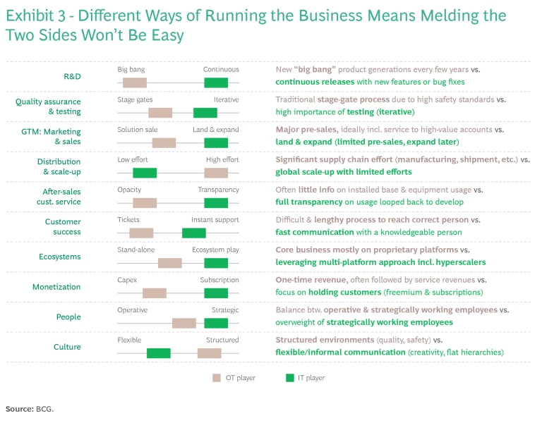 For example, in the realm of R&D, OT players typically deliver a “big bang” product upgrade every few years while most software players (especially SaaS) deliver bug fixes and new features every few days or weeks. Going forward, OT will need to work harder to stay continuously connected to the customer to understand usage better and gain insights into how to improve products more frequently.