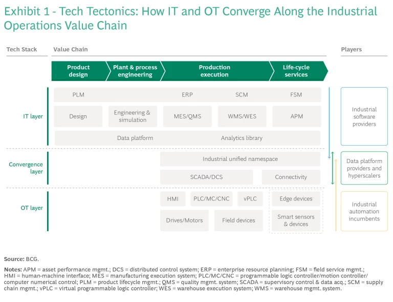 IT/OT convergence can address the major challenges that manufacturers face while also unlocking new value pools for IT and OT players. As we’ve noted, we expect more than 50% of the greenfield projects over the next five years will leverage the evolving IT/OT tech stack. Now is the time for incumbent players to begin securing their share of business and shaping the emerging ecosystem—or risk losing relevance.