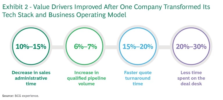 Exhibit 2 shows the outcomes the company achieved through its transformation. The quick and seamless integration of tools and processes that salespeople actively used enabled the organization to turn its tech stack from an impediment into a competitive advantage.