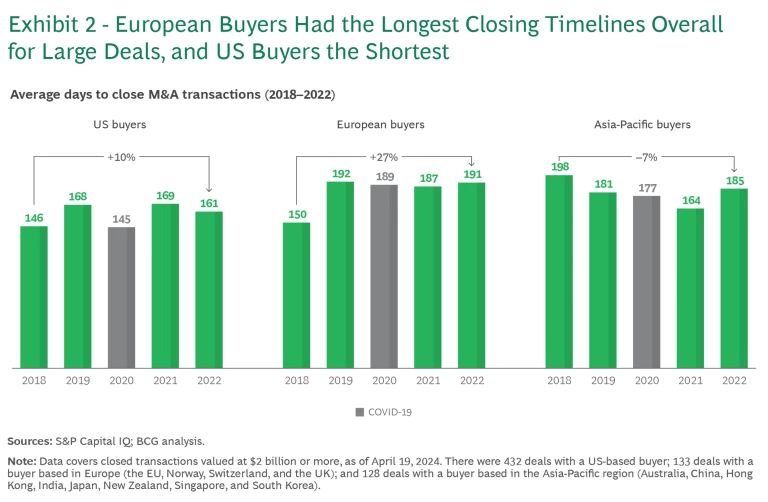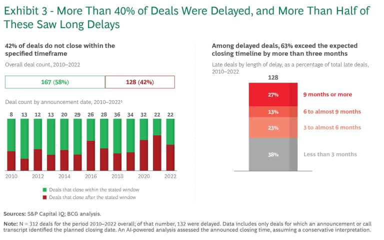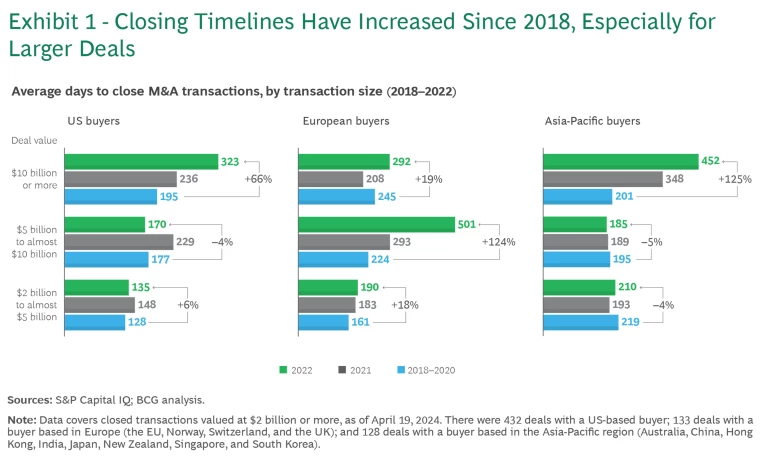 A recent BCG study analyzed how these challenges affect the timelines and complexity of closing large M&A deals. The study produced three main findings: