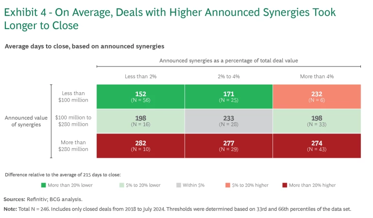 - Transactions with higher announced synergies, either as a percentage of deal value or in absolute terms, took 30% longer than others to close.