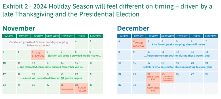 - The compressed peak season, the desire to wait-out higher media costs around the election, and fewer days between Thanksgiving and Christmas could create more active media and promo competition during Peak Season
