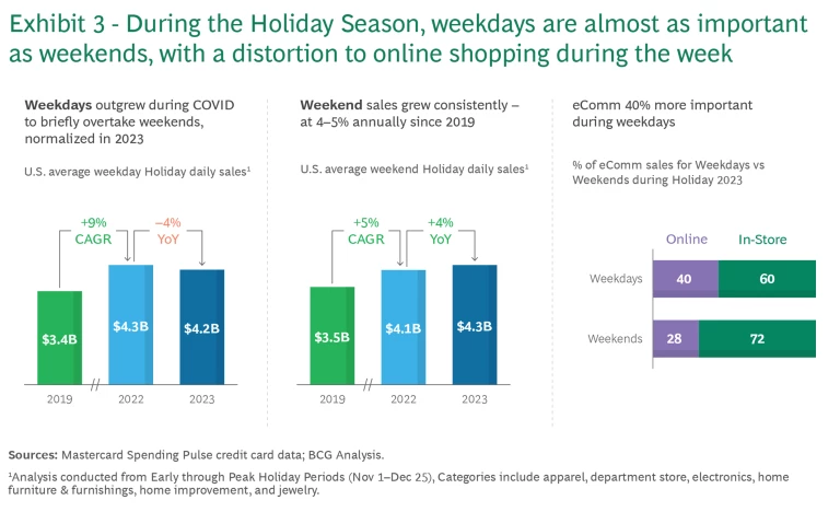 But retailers shouldn’t underestimate the importance of weekday shopping. E-commerce has continued to grow, and the prominence of online channels is 1.4x higher during weekdays. This raises the stakes for digital experiences Monday through Friday. With online shopping comprising 40% of weekday shopping, it is quickly approaching the status of primary channel for consumers making weekday purchases, and we wouldn’t be surprised to see online exceed 50% of weekday spending in the next 2-4 shopping seasons. The takeaway? Winning the holiday season and achieving growth targets in 2024 and beyond will rely more on weekday success online than on record in-store days on the weekend.