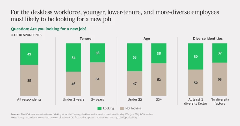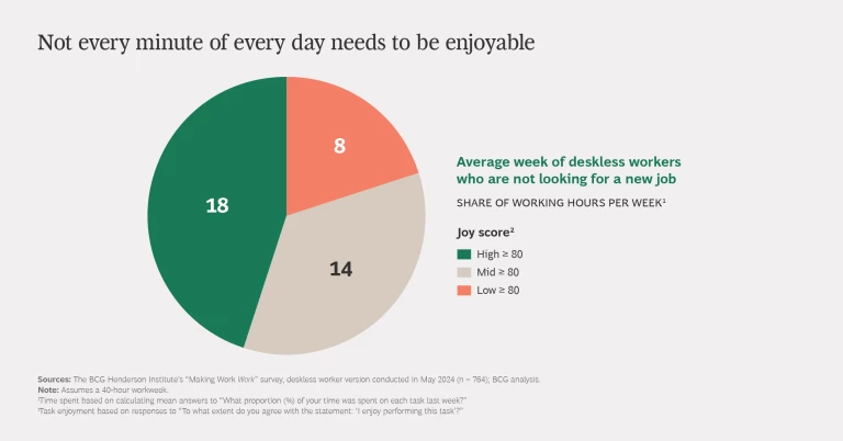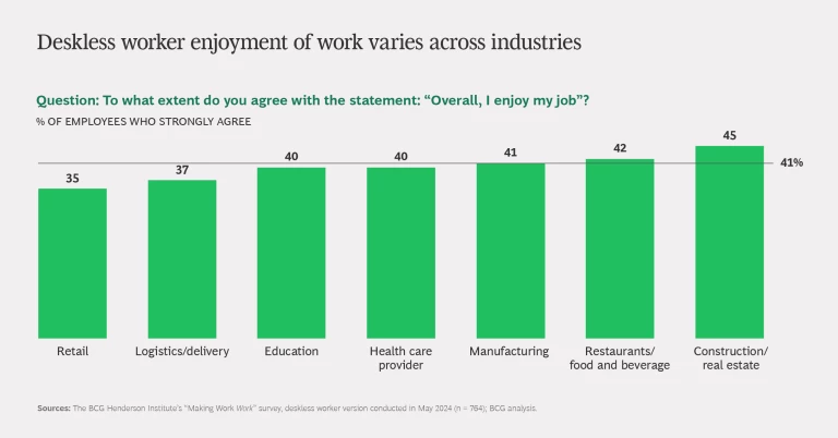 In an earlier version of our “Making Work Work” survey, we explored employment trends among office workers—defined as employees who can do most of their work from anywhere, provided they have a laptop and internet access. We found that people’s enjoyment at work strongly correlates with their decision to stay in their role. In the most recent iteration, we sought to understand the attitudes of deskless workers—those who need to be at a physical location or asset to conduct most of their tasks—toward their work.