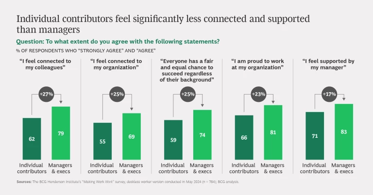 Among deskless workers, individual contributors (ICs) have a lower joy score (–10%) and higher attrition risk (+9%) than managers. When we investigated further, we found that ICs feel significantly less connected to their organization and colleagues and less supported by their managers, have lower levels of pride in their work, and perceive less fairness in their workplace.