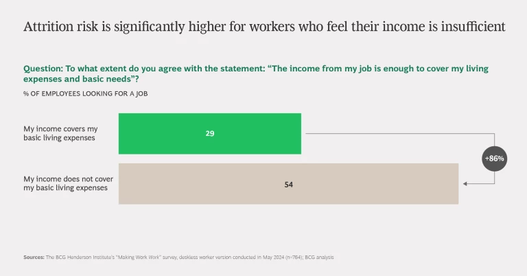 While our research shows how important it is to make work enjoyable, it’s important to bear in mind that joy at work is not a panacea, and it cannot offset the attrition risk associated with economic insecurity. The attrition risk for those who find their income doesn’t cover their living needs is 86% higher than for those who do (54%, compared with 29%). Within the former group, those who enjoy their work have a lower attrition risk—45% versus 54%—but it remains above the survey average of 41%.