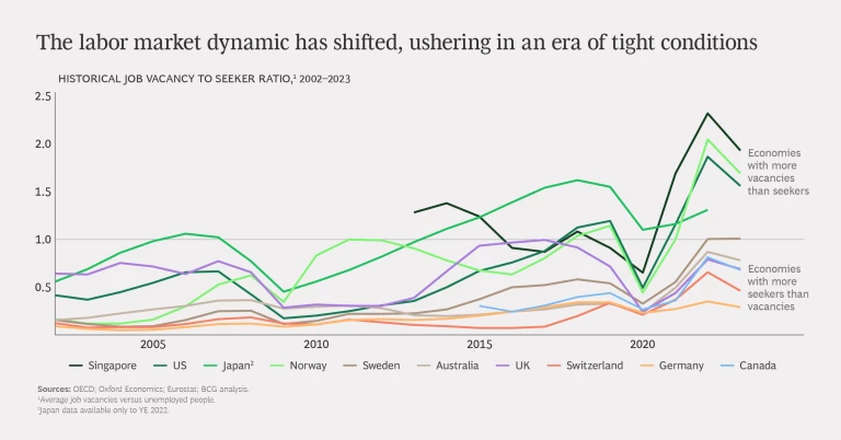 Although the labor market has softened slightly in 2024, many economies are confronting some of the tightest conditions they have experienced in the last two decades. Just last year, Singapore, the US, Japan, Norway, and Sweden all had more job openings than job seekers. Layer on structural factors such as skills gaps and geographic constraints, and it’s clear why company leaders are still very worried about attracting and keeping great talent.