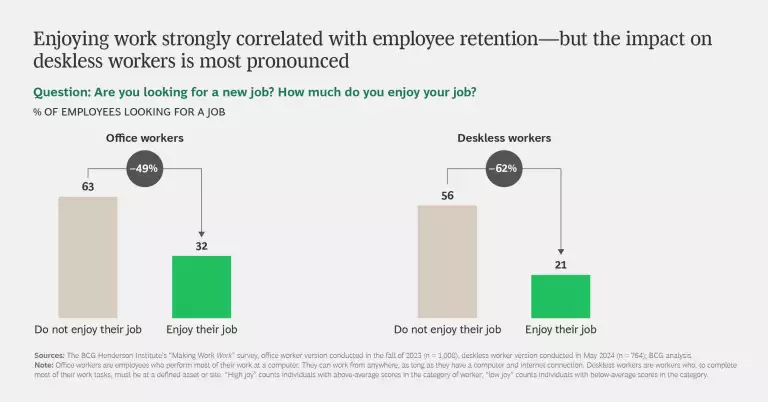 Enjoying work matters even more for retention of deskless workers than it does of office workers: enjoyment can cut deskless workers’ attrition by 62%.