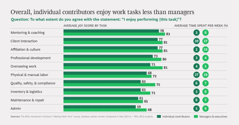 For example, for “affiliation and culture” work, there is a 4-percentage-point enjoyment gap between ICs and managers—although it is still one of the most enjoyable tasks for most cohorts. Not only do managers enjoy it more, but they also spend five times as much time per week on this task than ICs.