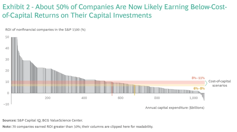 A look at the $1 trillion of annual capital investment by the nonfinancial companies in the S&P 1500 makes the point. Each column in the bar chart in Exhibit 2 represents a company’s most recently reported return on investment. At a weighted-average cost of capital of 8% to 11%—a reasonable estimate for many companies in the current interest rate environment—about half the companies, on average, are earning below-cost-of-capital returns. The picture will only worsen should rates rise higher.