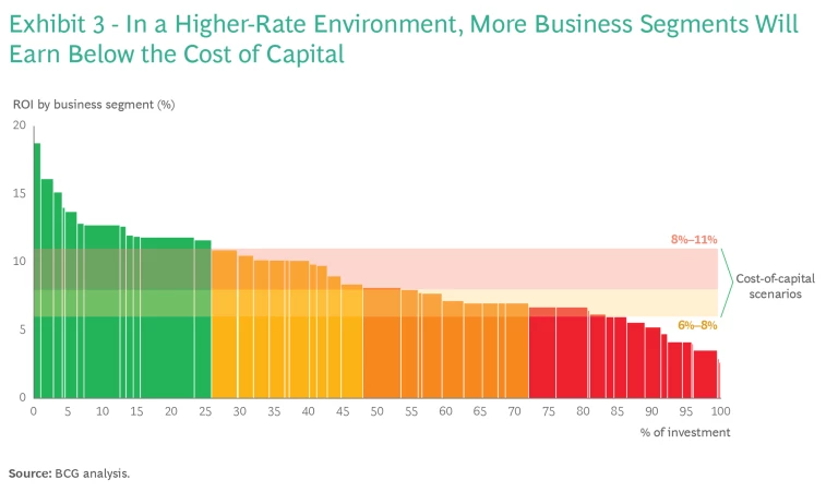 The picture looks a lot like Exhibit 2 but feels more personal—and urgent. After all, low-return segments that drain strategic resources (such as capital, management time, and talent) will increasingly impair results, particularly in a higher-rate environment.