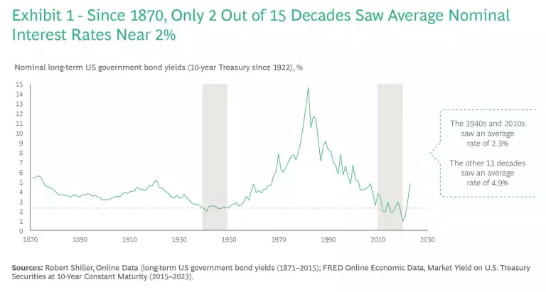 A look at the last 150 years of economic history shows that our recent low-rate environment was atypical. Since the 2007–2008 financial crisis and until recently, nominal long-term interest rates were about 2%. But we have seen sustained rates at such a low level only once before in US history: to support the wartime economy of the 1940s. (See Exhibit 1.) Over the rest of the period, nominal interest rates averaged 4.9%—and the average remains above 4%, even if you exclude the period between 1975 through 1986, when the Federal Reserve pushed rates up substantially to combat entrenched expectations of inflation.